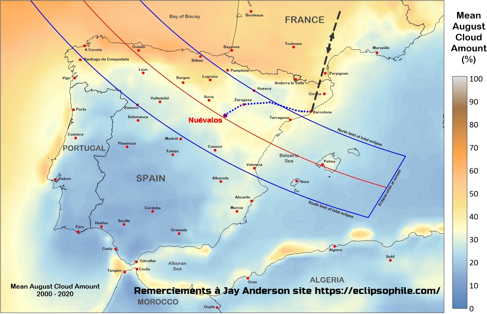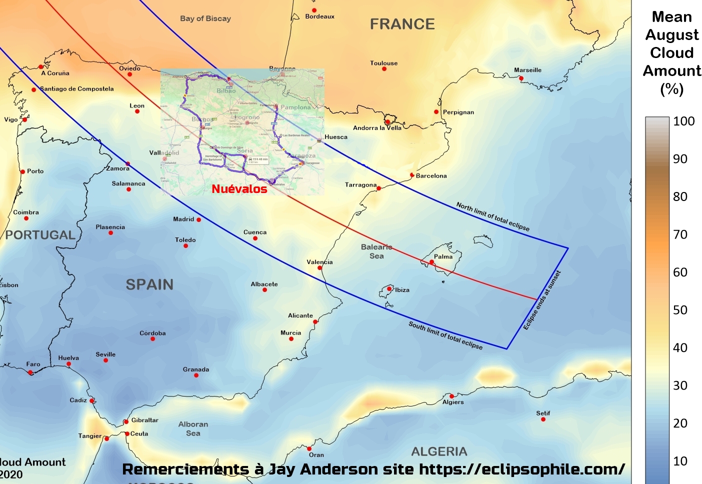 Observation de l’éclipse en fin de journée : A 30 mn de route et 40 km, vous croiserez la ligne de centralité vers Ayuntamiento de Torreblacos.
